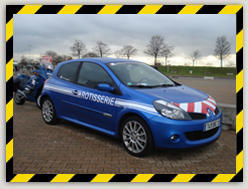 Le décor, avec un liseré bleu et une caisse installée derrière des barreaux, crée l'ambiance d'entrée ; les employés portent l'uniforme presque parfait du policier.